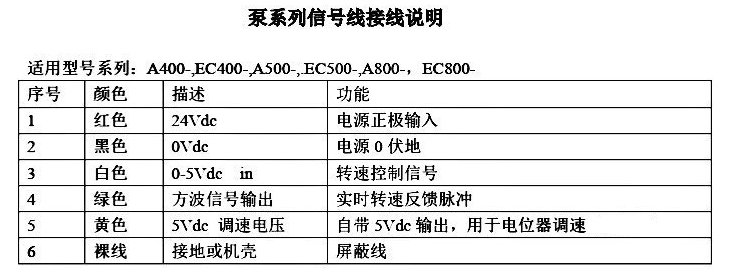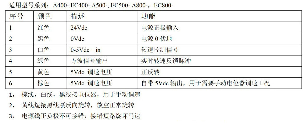 2、對于用電位器控制轉速的客戶,在此5信號線的基礎上加了一根棕色線,提供5Vdc基礎調速信號,供給電位器作為調速信號電源(訂貨時需要說明)